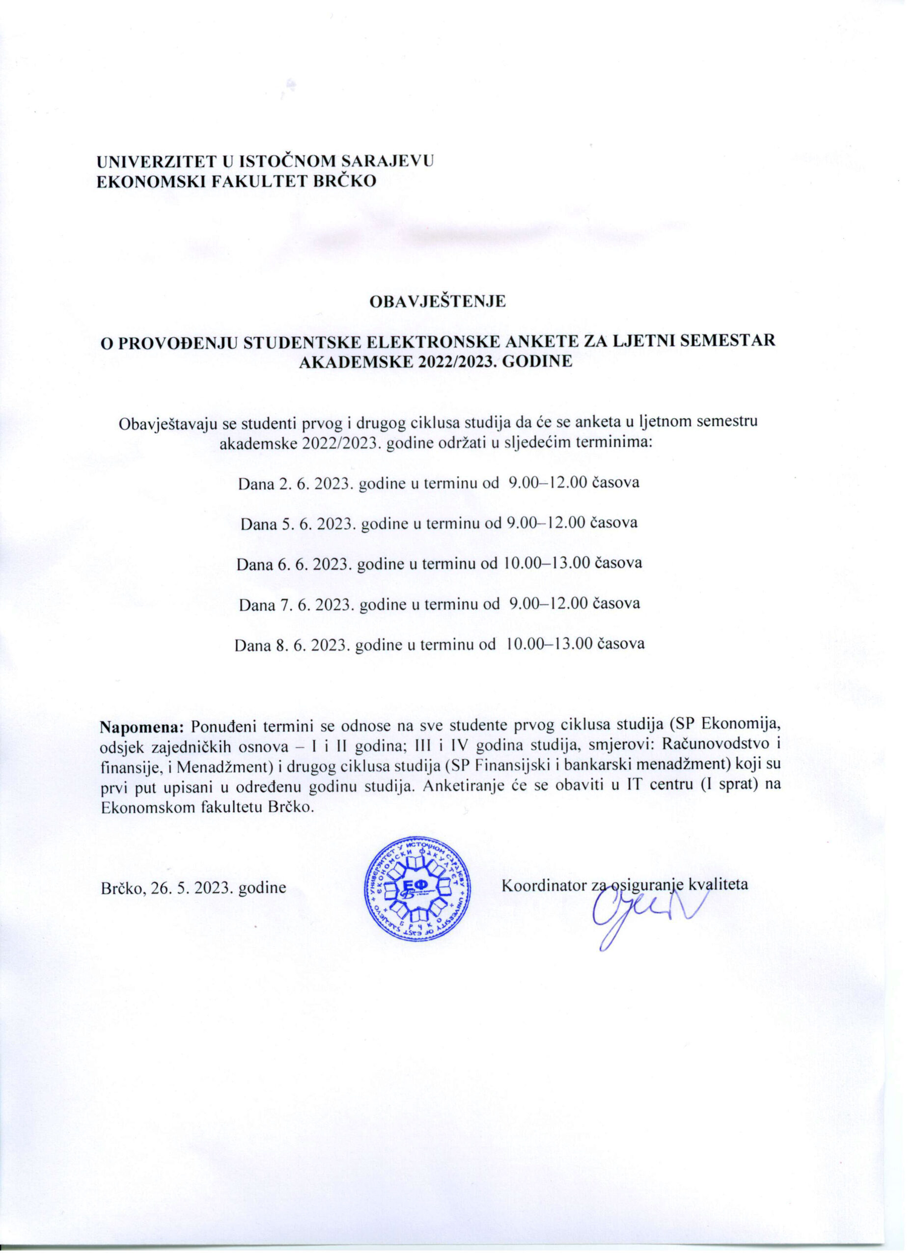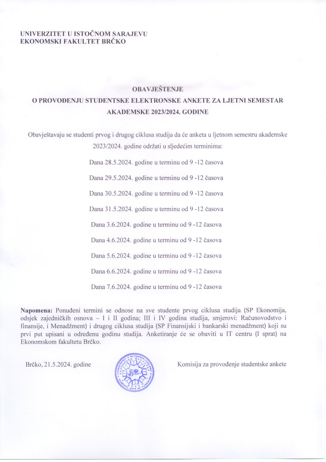 Јавна одбрана завршног рада кандидата Слађане Пурић под називом: \"ДЕТЕРМИНАНТЕ И ОГРАНИЧЕЊА КОНКУРЕНТНОСТИ ПРИВРЕДЕ БОСНЕ И ХЕРЦЕГОВИНЕ\" одржаће се 01.11.2024. године у сали за сједнице Економског факултета Брчко, са почетком у 11,00 часова. Завршни рад се може погледати сваким радним даном у Библиотеци.